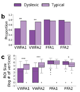 b, Proportion of participants with usable data who had a VWFA or FFA of any size present at baseline in typical (light purple) and dyslexic (purple) readers for each ROI.