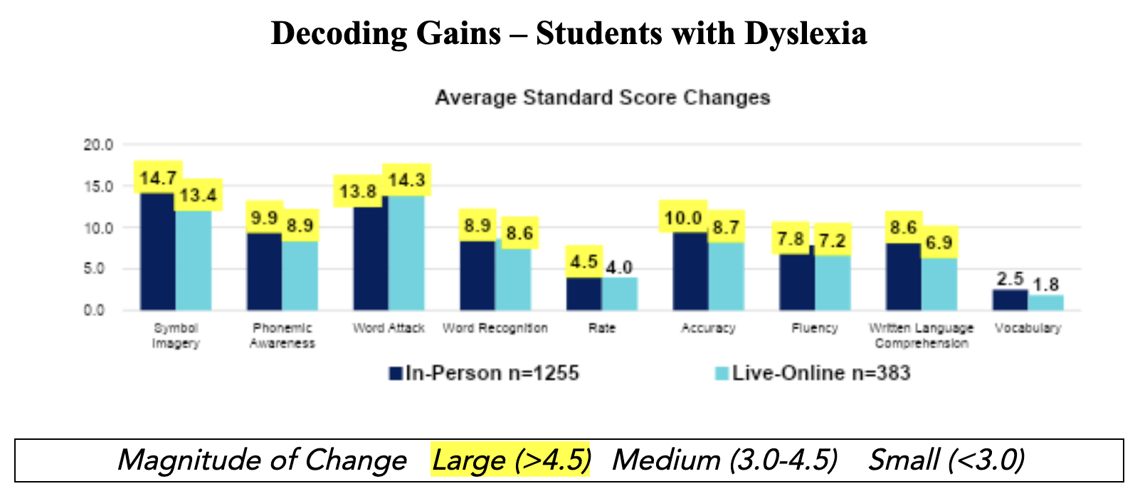 Within the decoding-only category, students diagnosed with dyslexia were measured for both progress and comparison. Other than vocabulary, both populations achieved medium to large standard score gains (eight of nine measures). Live-online and in-person students tested statistically significantly higher on post-instruction on all measures.