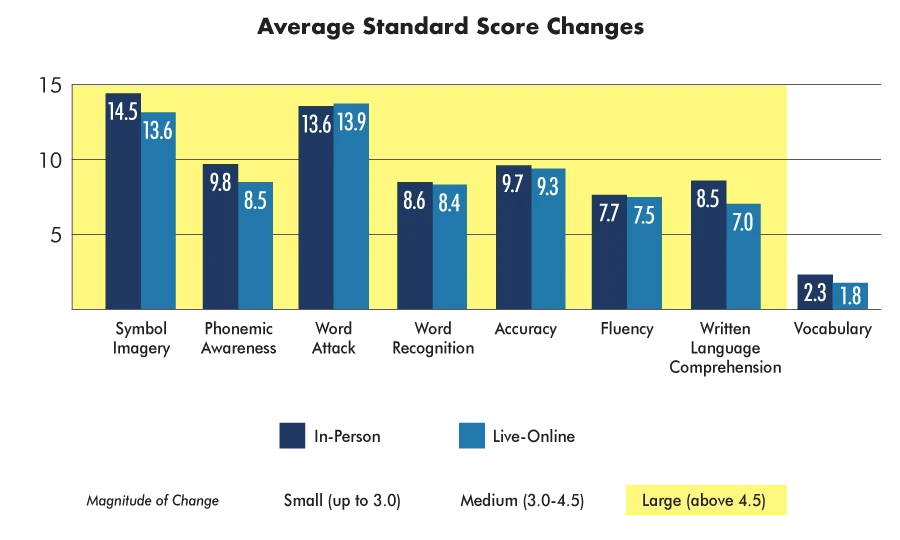 More specifically, other than vocabulary, which was not addressed, both populations achieved medium to large standard score gains, with live-online and in-person students testing statistically significantly higher on post-instruction on eight of nine measures.