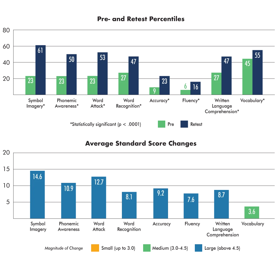 On average, students with a prior Dyslexia diagnosis who received both Seeing Stars and Visualizing and Verbalizing instruction achieved significant improvements in reading. They made large (statistically significant) standard score changes on eight of the nine measures. The 20-point percentile increase in Word Recognition put these students well within the normal range (25th–75th percentile). The large average standard score change in Reading Accuracy should also be noted.