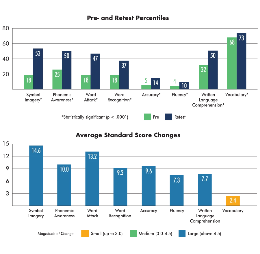 On average, students with a prior Dyslexia diagnosis who received Seeing Stars instruction achieved significant improvements in reading. They made large (statistically significant) standard score changes on seven of eight measures. Vocabulary was not a targeted measure of instruction. The 19-point percentile increase in Word Recognition put these students well within the normal range (25th–75th percentile). The large average standard score change in Paragraph Reading Accuracy should also be noted.