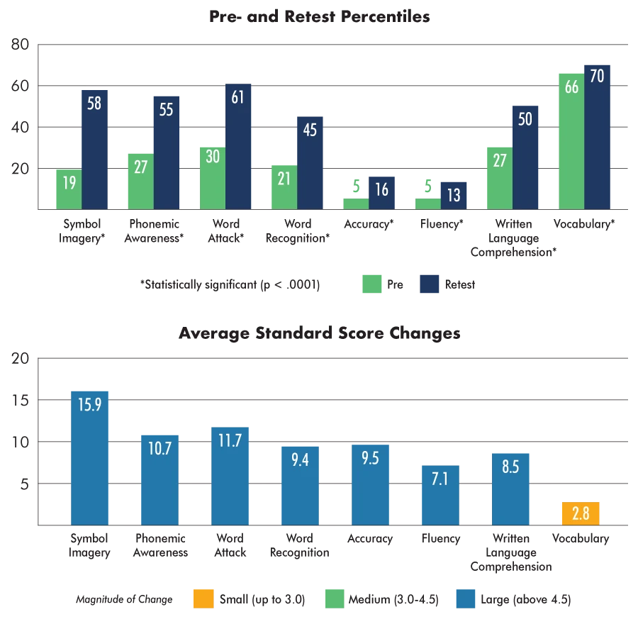 ESL students who requested an accelerated approach to developing their decoding skills received instruction in the Seeing Stars program. On average, they achieved excellent improvements on all measures of reading. They made large (statistically significant) standard score changes on seven of eight reading measures. Vocabulary was not a targeted measure of instruction. As a result of significant improvements in Phonemic Awareness and orthographic awareness (Symbol Imagery), they experienced an average 24-point percentile increase in Word Recognition and a 23-point percentile increase in Comprehension. These increases in their English reading skills put these students well within the normal range (25th-75 percentile).