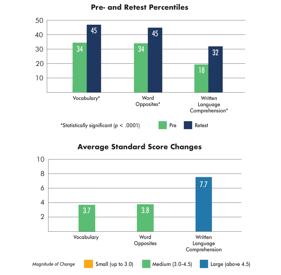 On average, High School students who received Visualizing and Verbalizing instruction achieved significant improvements in comprehension. They made medium (statistically significant) standard score changes on two of the three measures. Additionally, the 14-point percentile increase in Written Language Comprehension put these students within the normal range (25th–75th percentile).