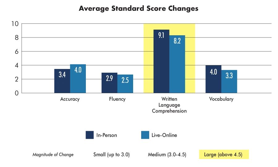 This intervention focused on language comprehension. Both populations achieved comparable large standard score gains on Written Language Comprehension. Live-online and in-person students scored statistically significantly higher on post-instruction.